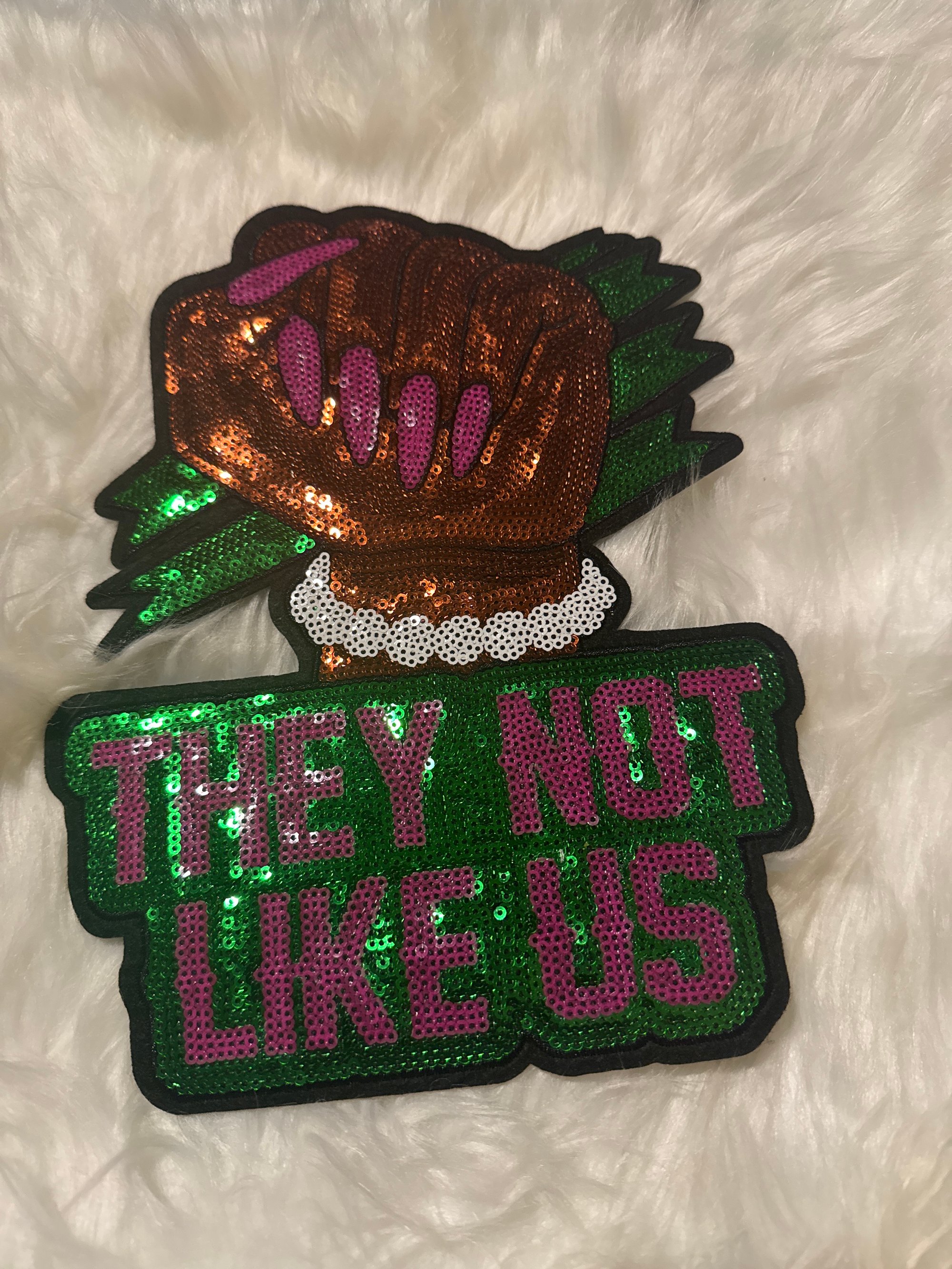 Lg brown fist with pearls, pink & green they not like us